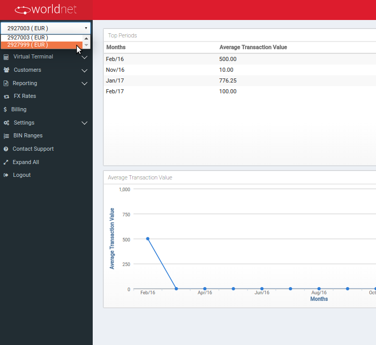 If there is more than one terminal assigned to your account, this will be a drop-down list with all your active terminals and their currencies. You can switch between your terminals using this menu, and the currently active terminal will be highlighted.